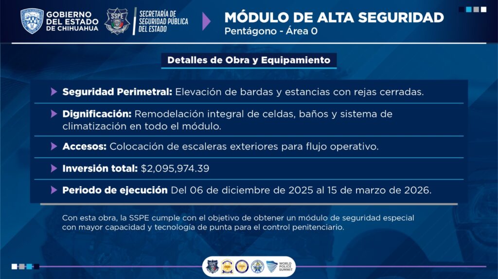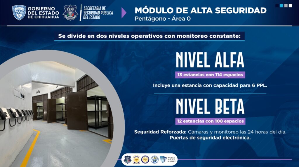 El secretario de Seguridad Pública del Estado, Gilberto Loya Chávez, anunció la rehabilitación del área conocida como “Pentágono” o Área Cero del Centro de Reinserción Social No. 3, en Ciudad Juárez, la cual fue adecuada para albergar a personas privadas de la libertad de máxima peligrosidad, bajo estándares modernos de seguridad y control.